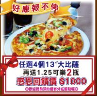 任選4個13"大比薩+2瓶1.25L可樂或雪碧